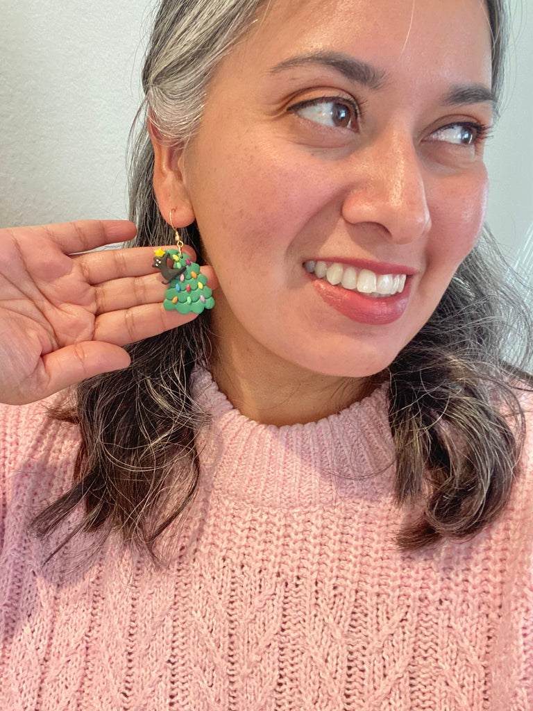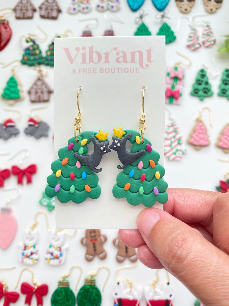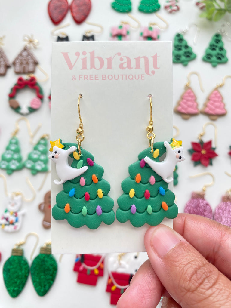 Christmas Cat on the Christmas Tree Clay Earrings